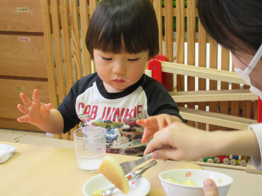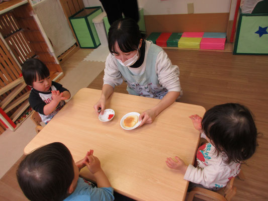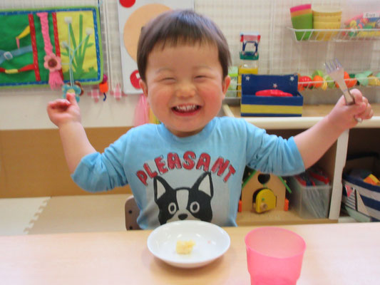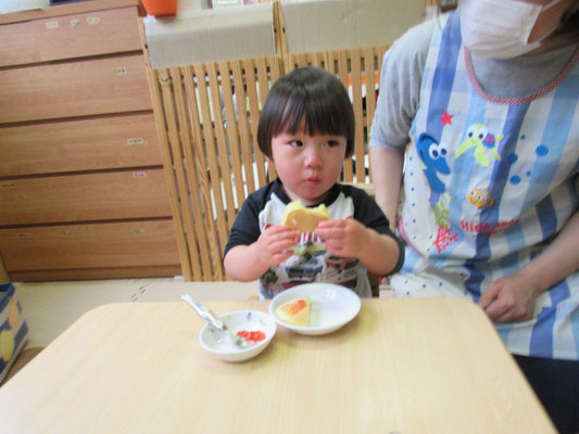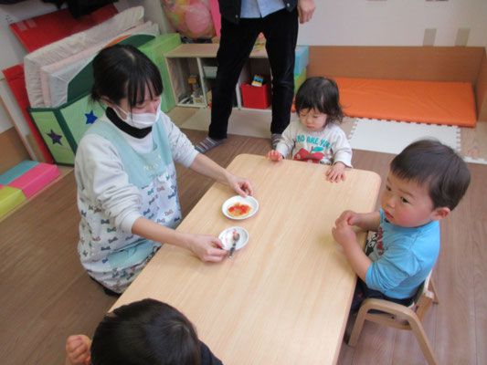 いつもおやつの時間が待ち遠しく、調理の先生が持ってきてくれると”パチパチ~~!”と拍手をしてお出迎えしているほし組さんです^^(笑)先生の名前を覚えて「○せんせい~!」とうれしそうな子どもたちです♪