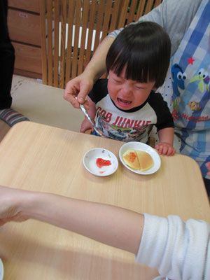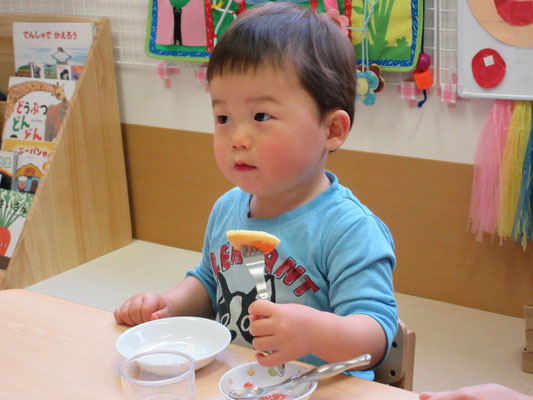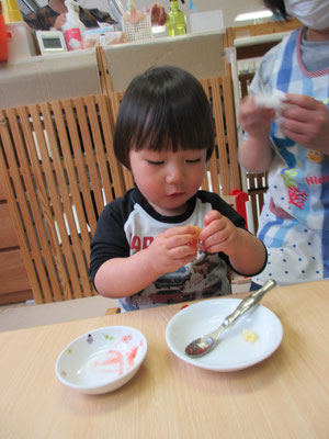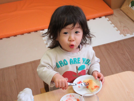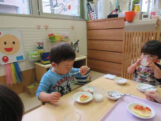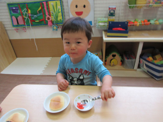 まずはジャムだけペロッとなめてみるSくん、サササっと自らジャムをすくって塗っていくHちゃん、一口目はプレーンの状態で頂くKくんなど個性がでていました!ちょっとした作業でも、その子の個性が見えて面白いですね♪