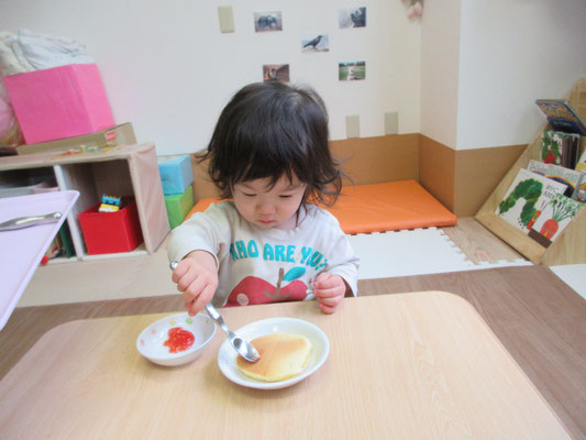 今日は食育として、”ホットケーキにジャムを塗って食べる”体験を行いました!