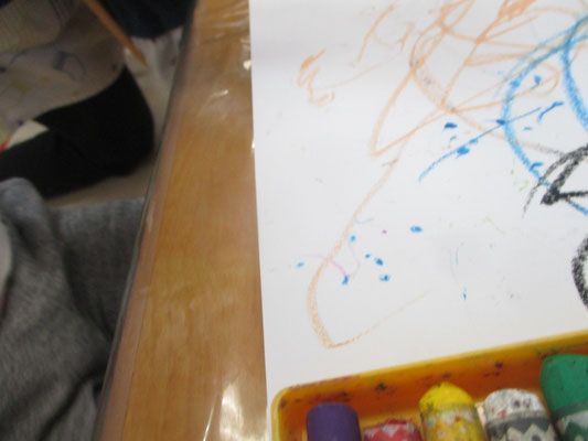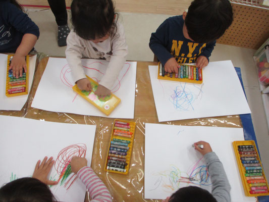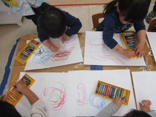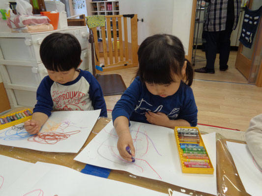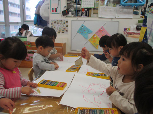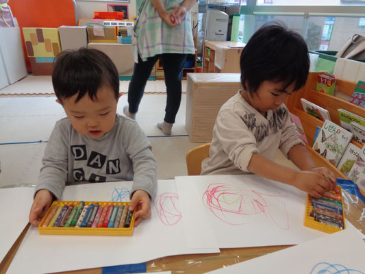 今日は雨だったので、室内でクレヨンを使ってお絵描き!