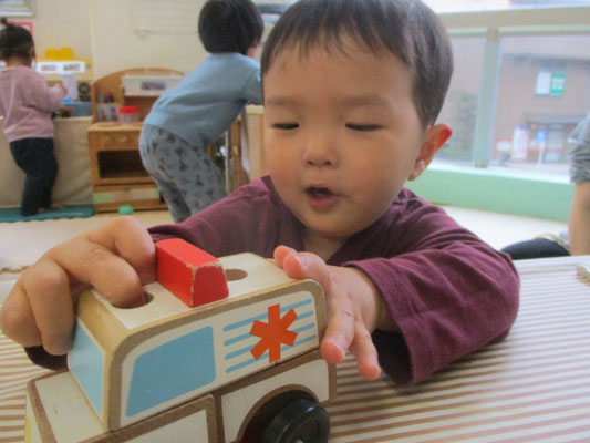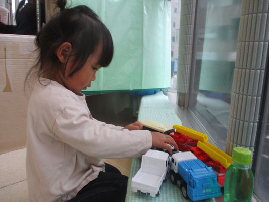 赤色を取って「しょうぼうしゃの色だね!」などとお話しながら、集中して取り組んでいました。また、青色でトントンと叩く様に塗りながら「あめだ~!」とお話してくれた子が!みんなも真似っこして、トントンと雨を描いていました^^