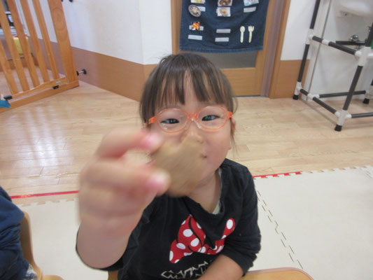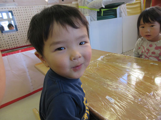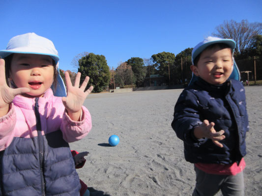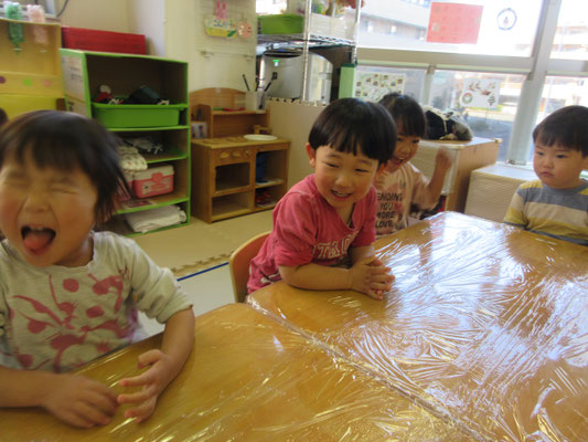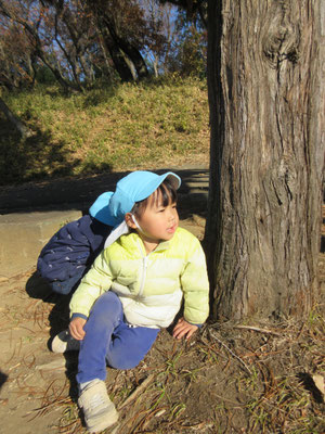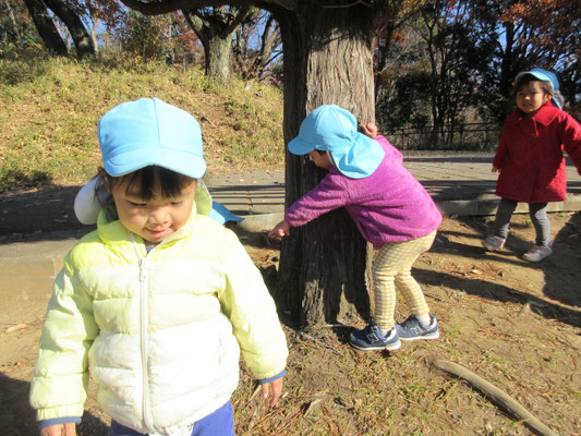 今日は「かくれんぼしよう!」との一声に、「やるやる~~!」「わたしがおにね!」とやかくれんぼがスタート!「もういいかい!」「ま~だだよ!」「もういいよ!」と辺りをキョロキョロ…「みーつけた!」と友だちを見つけると「キャ~~~!」と逃げ、大笑いの子どもたちでした(笑)