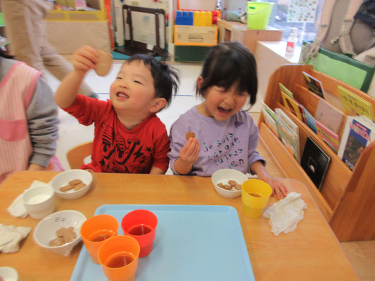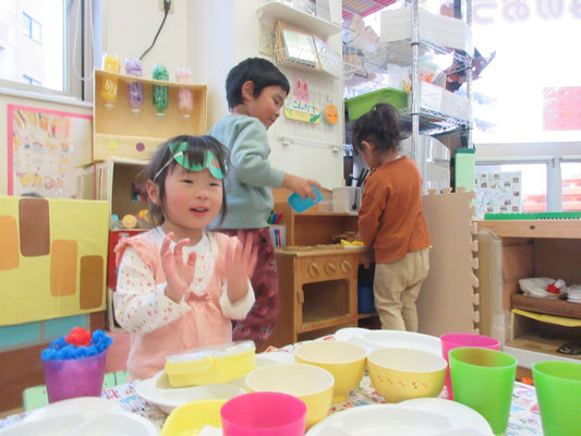 遊びを楽しむとき、前までは保育者と1対1のやりとりを楽しんだり、自分の遊びの世界に没頭して遊んでいた子どもたち。今は友だち同士で、遊びに誘い合い一緒に楽しそうに遊ぶ姿が増えています^^♪
