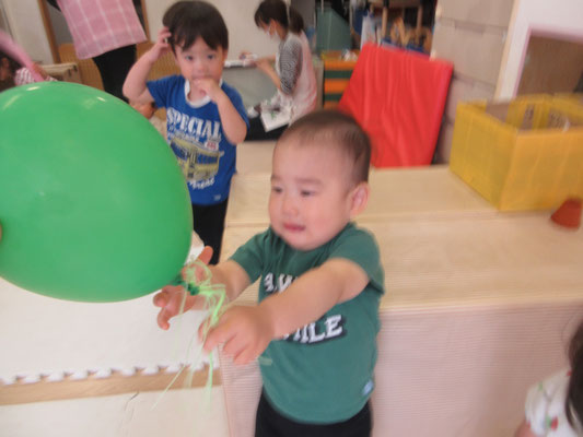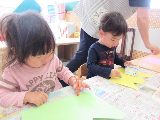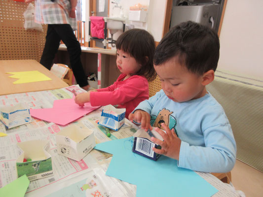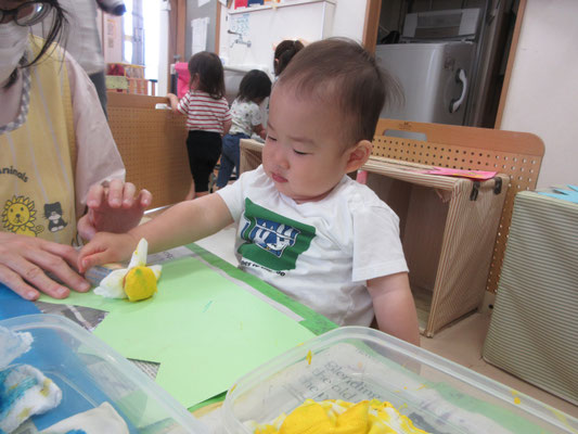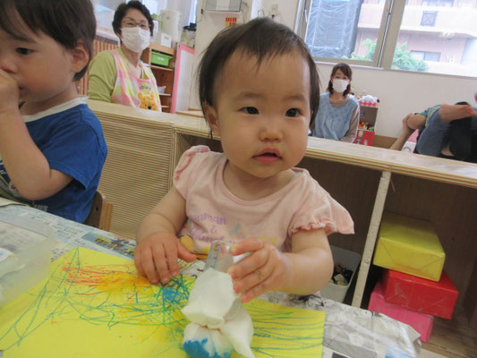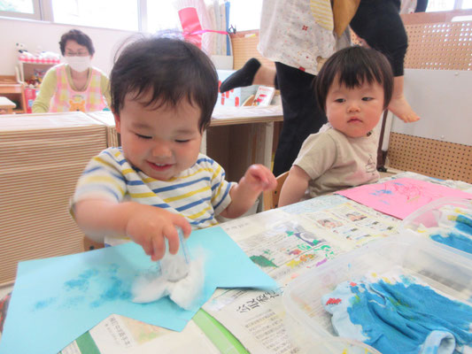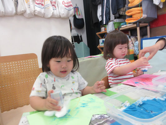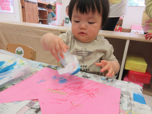前に、クレヨンでなぐり描きをしたので、今日はタンポで絵の具をしました。