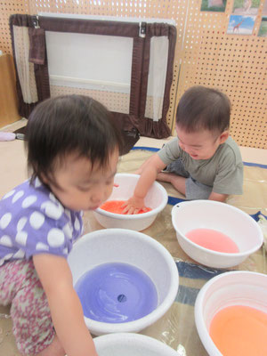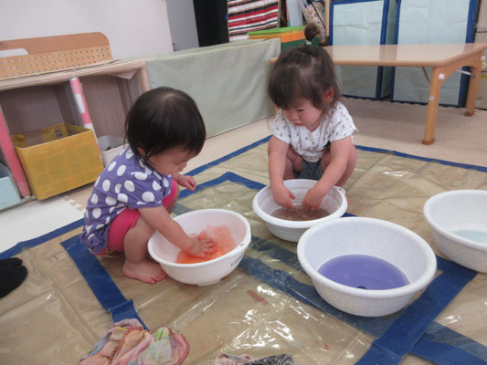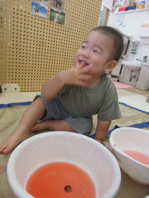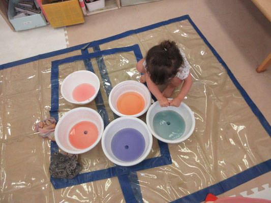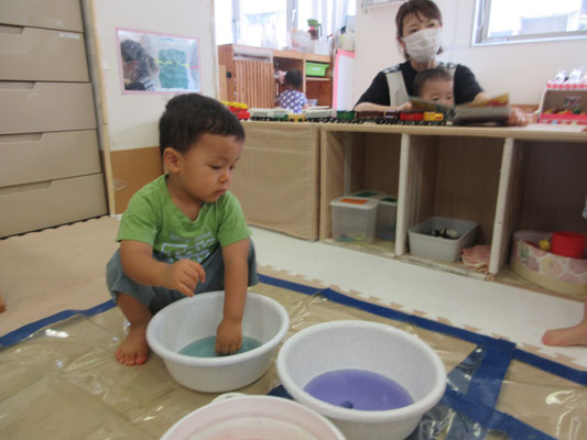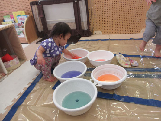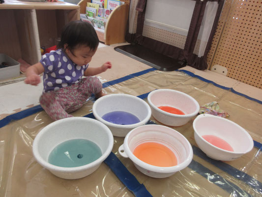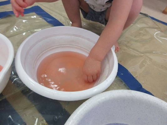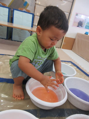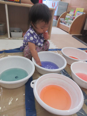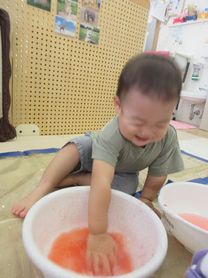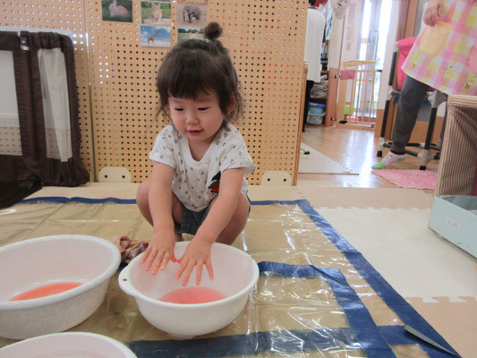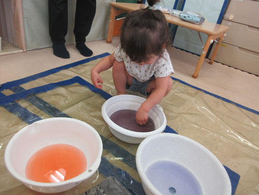 後半の方は、色と色を混ぜて「変わった!」と色の変化に気付く子もいました。感触遊びもたくさん取り入れてきたことで、色んなことに慣れてきています!
