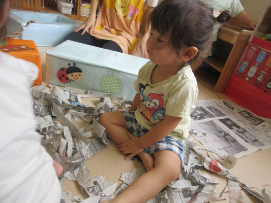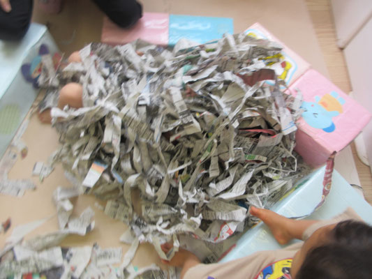 先週、久しぶりに新聞紙遊びをしました。指先使いもどんどん上手になっていて、細かく細かくちぎって楽しんでいました。