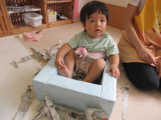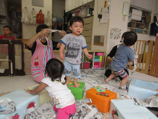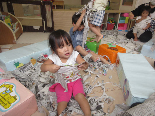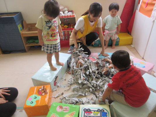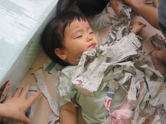 台を囲いにして、おふろごっこのようにしていたのですが、遊び方がどんどんダイナミックになっていき、みんなでかけあってかくれんぼのようにして遊んでいました♪「ばあ!!」と新聞紙の中から、友だちが出てくると大爆笑!!!
