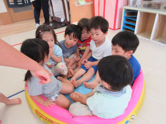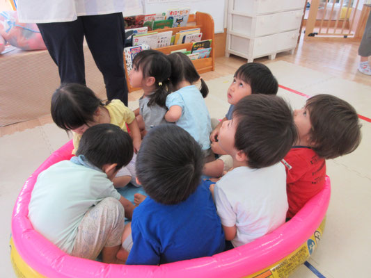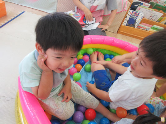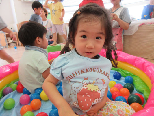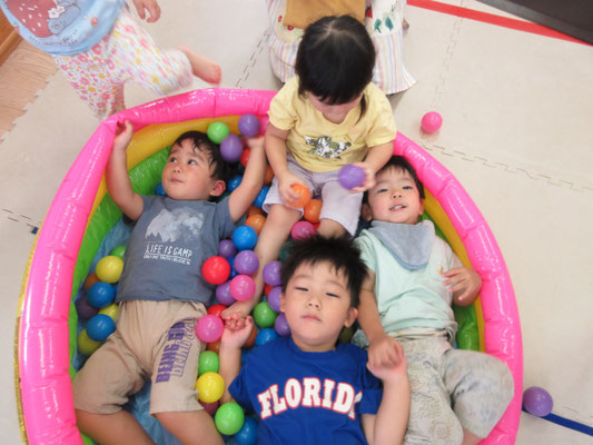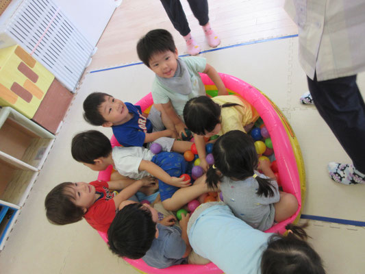 小さなプールに8人全員で入る…この窮屈さを楽しんでいるようでしたが、可愛かったです(笑)上からボールが降ってくるのを待っています♪