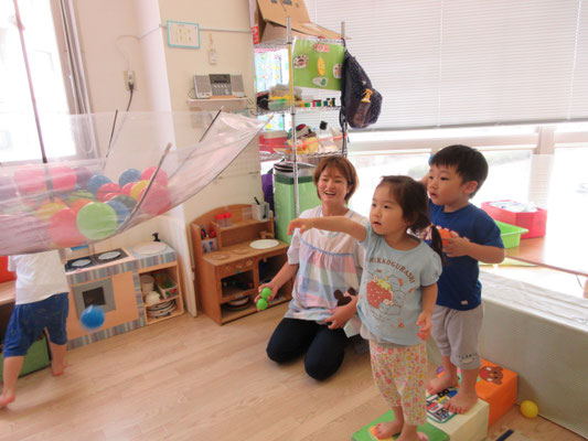 そのままプールで遊ぶ子もいれば、傘を上からつるして玉入れ!踏み台を使って上手に投げ入れます。