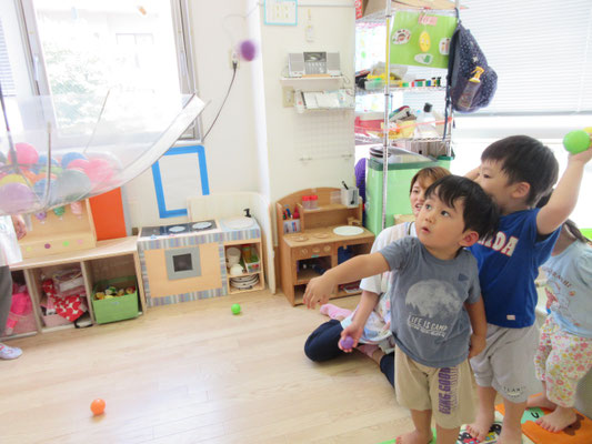 プールチームは「いいお風呂ね~」「あったかいね~」とお風呂ごっこを楽しんだり、洋服の中につめて「赤ちゃんがたくさん生まれます~」と産卵?していました(笑)穴があいてしまい、変形してしまったボールが唇のような形に見えて、口に当てて楽しんでいました。ボールを見ると野球を連想するのか、青のボールを取って「〇〇〇〇ー〇(球団名)のボール屋さんでーす!」と売ってくれる子もいました(笑)
