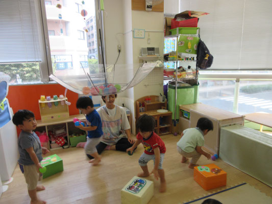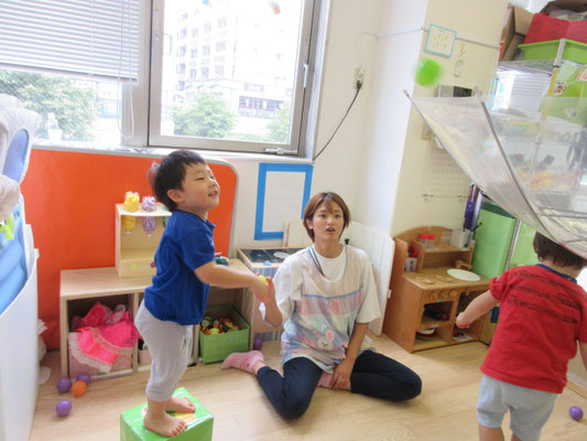 玉入れチームは、自分たちで踏み台の場所を移動させて、工夫していました!最終的に、平均台のように3台並べて、渡りながら(?)待機しながら(?)投げていました!手首のスナップをきかせて、投げられました!運動会に期待です♪