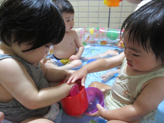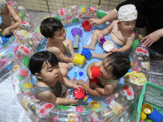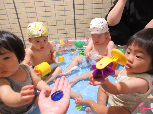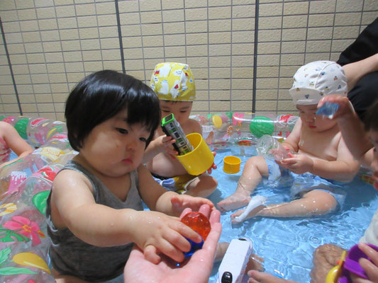大きなプールの中での環境にもすぐに慣れて、宝石集めや穴の開いたコップやペットボトルで自分の体に雨を降らせてみたりと次々玩具を手に取ってみながら夢中で過ごしていました♪