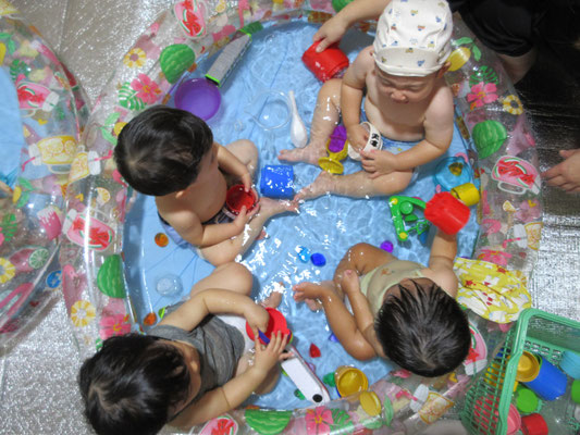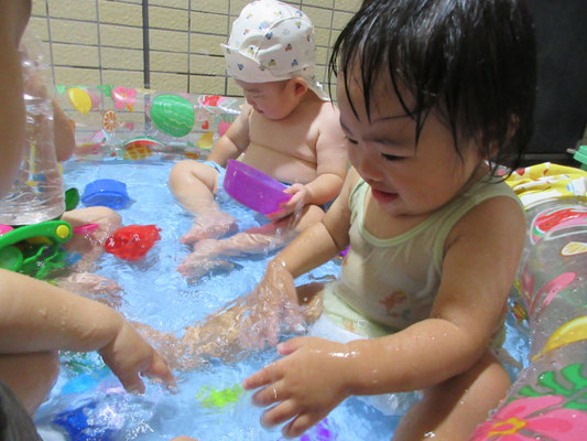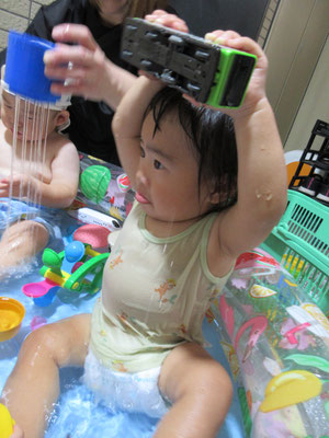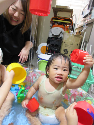 いつものほし組のプールと比べて深さと広さがあるので、コップで掬える水の量がいっぱい!手のひらで水面を勢いよく叩いてみた時の水しぶきも豪快!