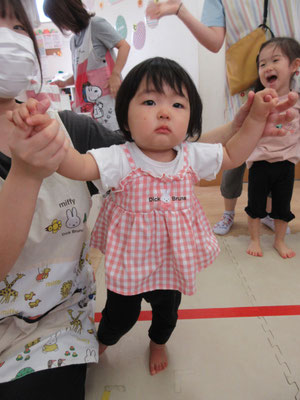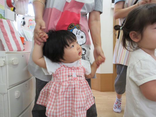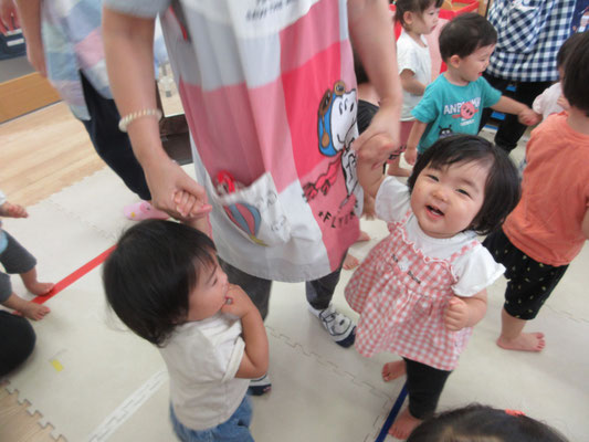 立ち上がって両手を上にして体を大きく動かしてリズムに乗ってみたり、屈伸運動のように体を上下に揺らしてみたり、と自由に音にのってみています。