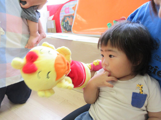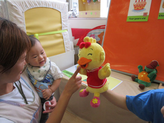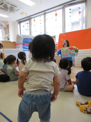 お話ややりとりを楽しむ時間では講師の先生がめくっていくイラストをじっと集中して眺める姿も。