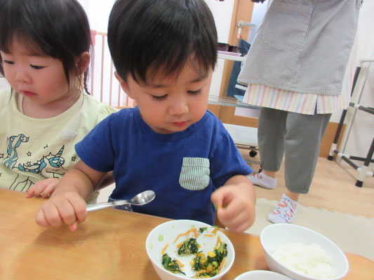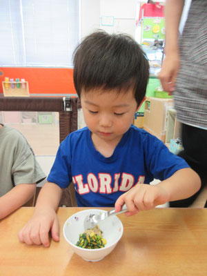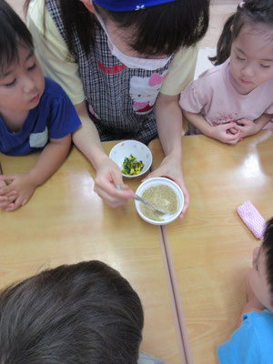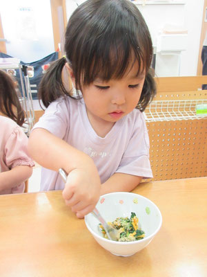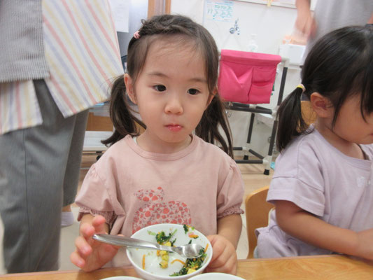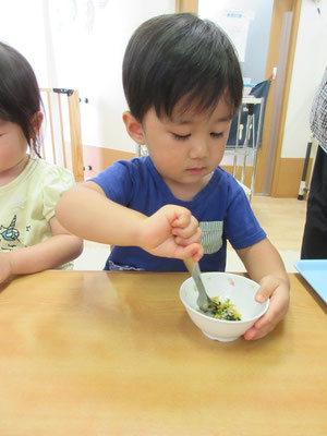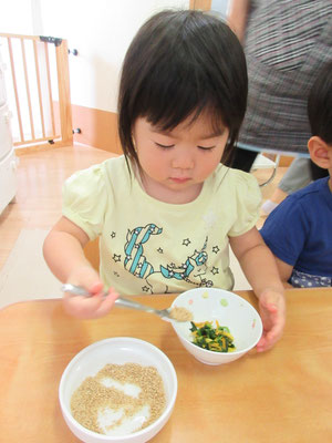 ほうれん草やにんじん、コーンはよくわかっていたのですが、「これなんだろう?」とゴマは少し難しかった様子。「ゴマだよ」と伝えると「ああ~!」と分かったようです!