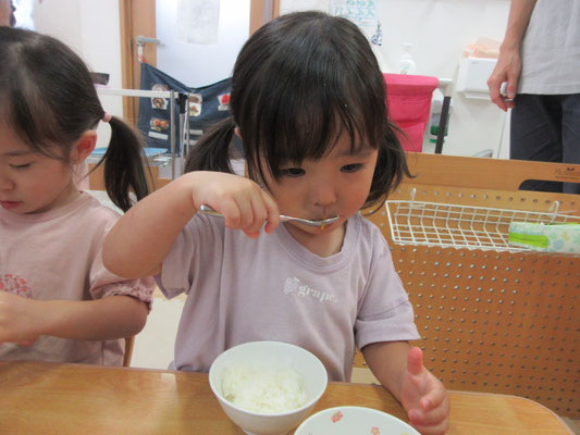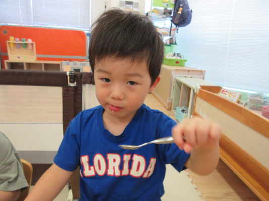 最近食具の三点持ちが出来るようになった子がいます。この持ち方が安定すると箸に移行しやすくなります。絵を描くときの、ペンの持ち方も一緒です。園でも励ましながら進めていきたいと思います!