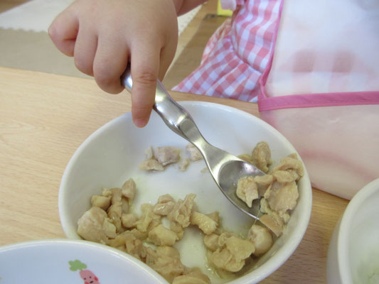 お家でも食具を使って食べてみているというSちゃん、スプーンの使い方も日に日に目を見張るほどに上達してきていて保育者もびっくり…!
