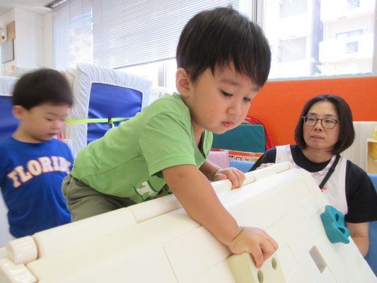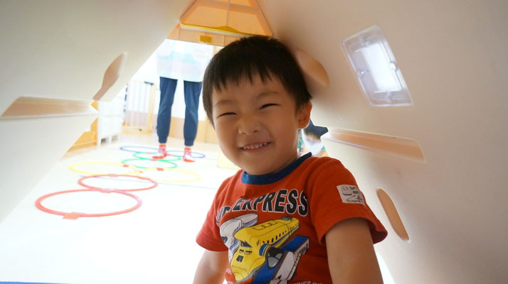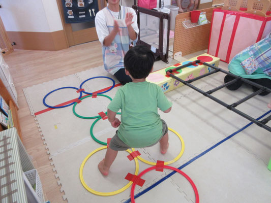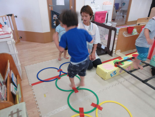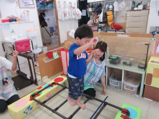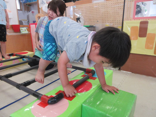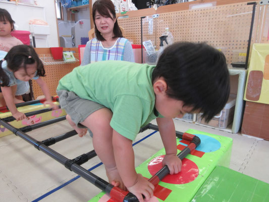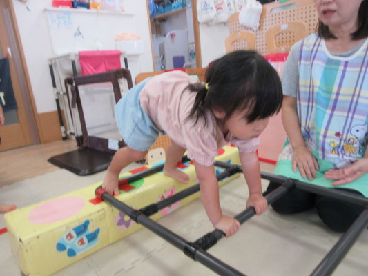ハシゴ渡りも上手になっています。自分でハイハイのように手足を交互に出して渡ることもあれば、保育者と手を繋いで歩いてみる子もいます!