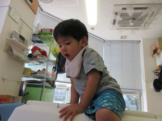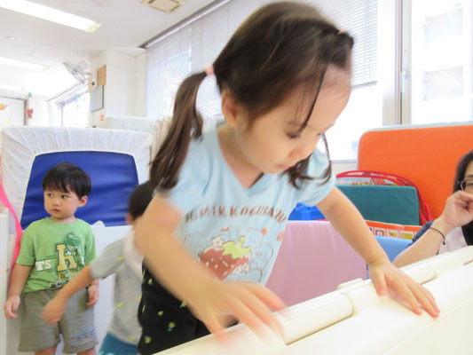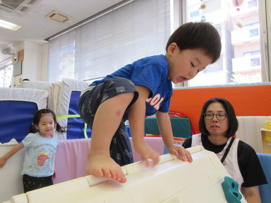 夏の室内遊びを通して、様々な運動遊びが上手になってきています!最近のお気に入りは山型のボルダリングです。手と足をどこにどうやって出したら良いのか…どこに力を入れたら良いのか…意外と頭を使うものなのですが、やっていくうちに上手になってきています。