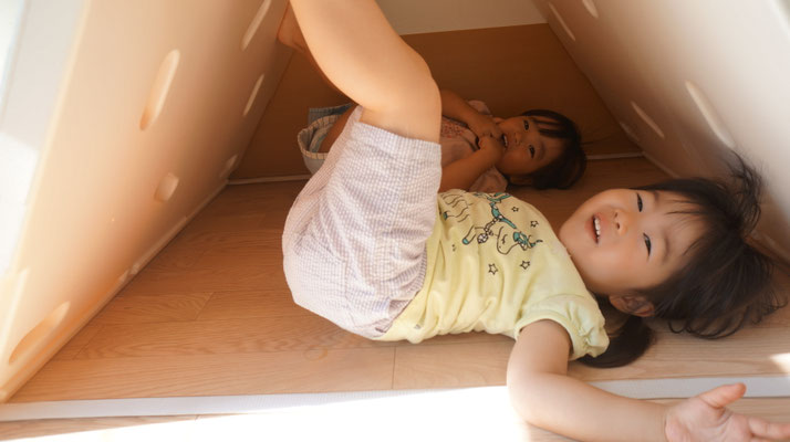 運動会終了まで山型のボルダリングを組み立てたままにしているのですが、普段は秘密基地のように遊んでいます!