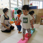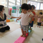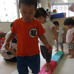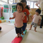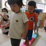 朝から活発なそら組さん♪牛乳パックの台を並べてみると、自然にみんな集まってきて平均台のように楽しんでいました!幅が細いタイプは、バランスを取るのが難しく渡れなかった子がほとんどでしたが、一人でできていて成長にびっくりしました☆