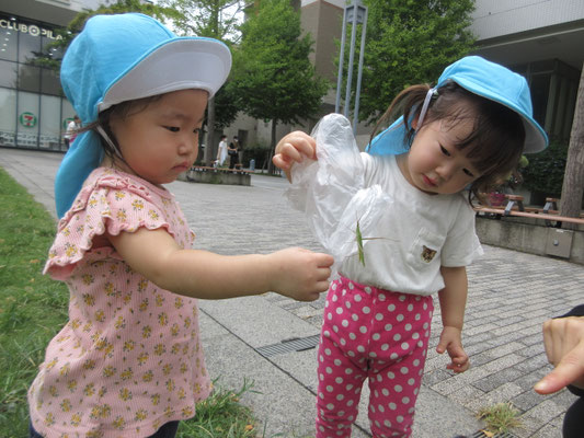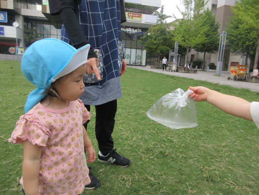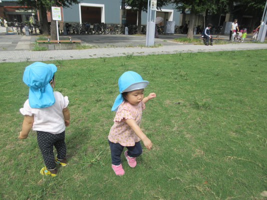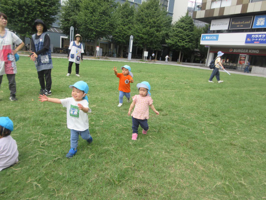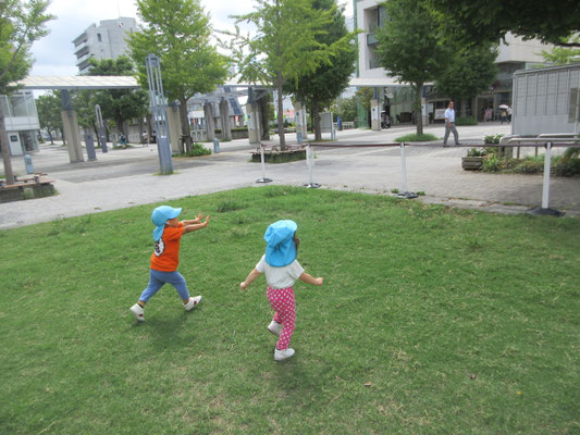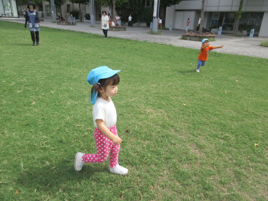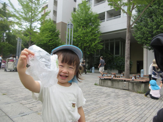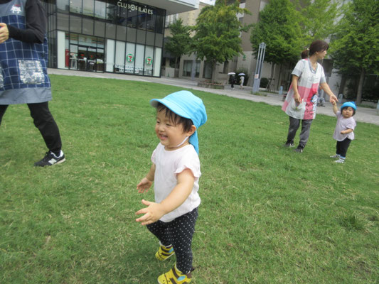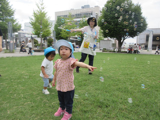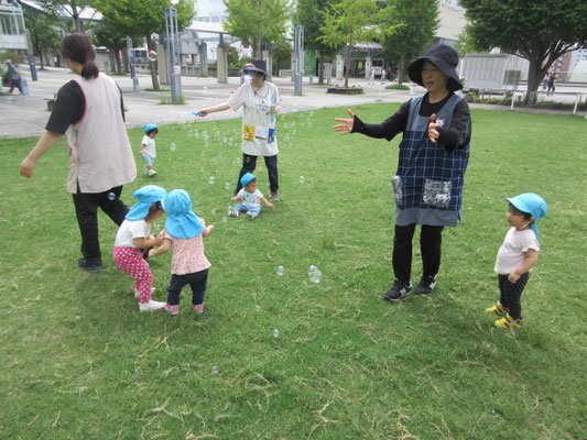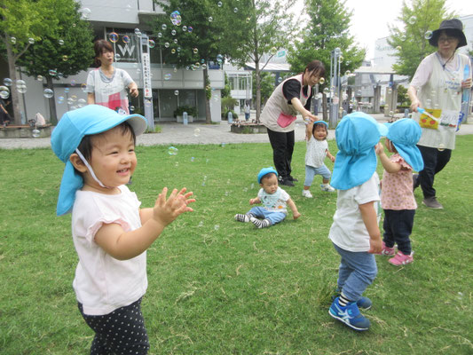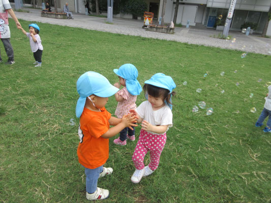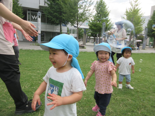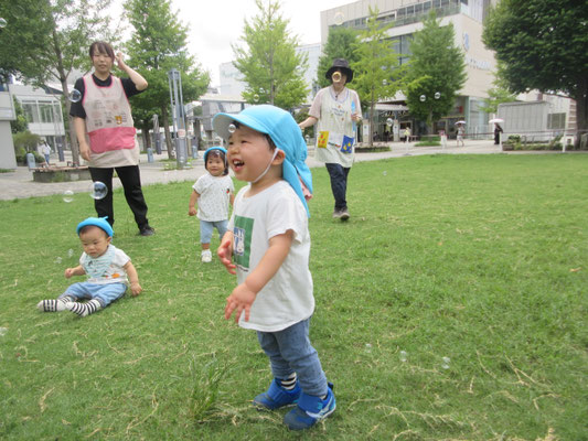 とんぼがたくさんとんでいて「とんぼ まてー!」と必死に追いかけたり、しゃぼん玉の玉を「パチン!!!」と取ろうとしたりして、大笑いしていました♪