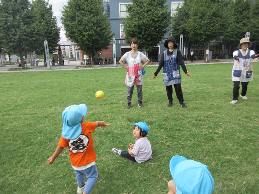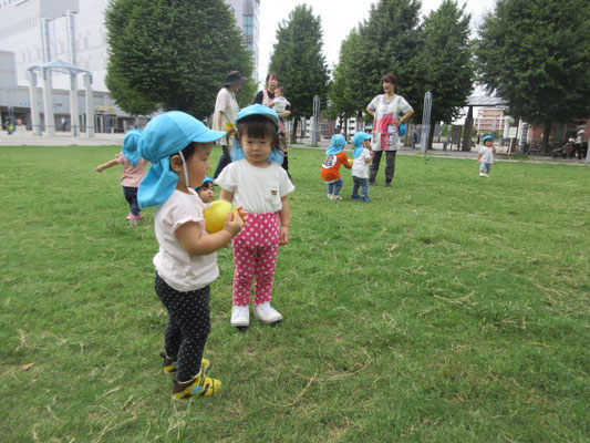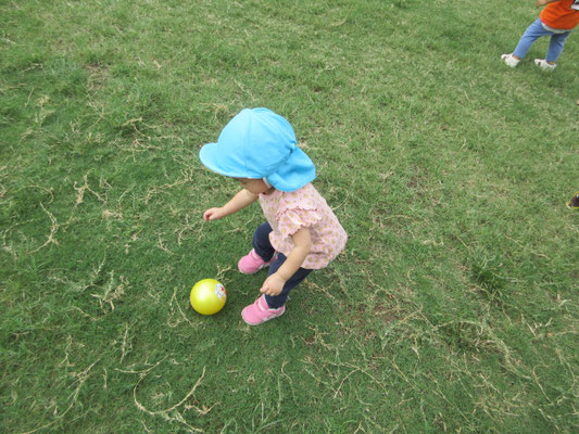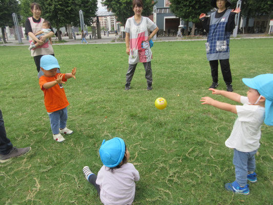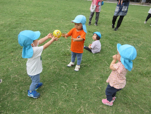 ボール遊びも少ししましたが「パス!!」と友だちに投げ合ったりもしたりし、遊び方にも成長を感じます(^^♪