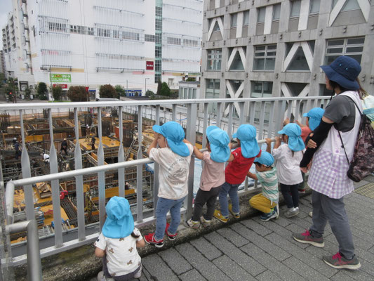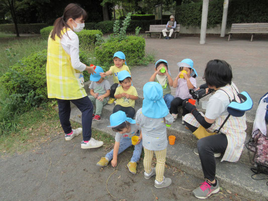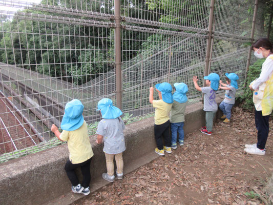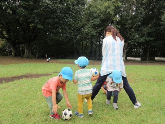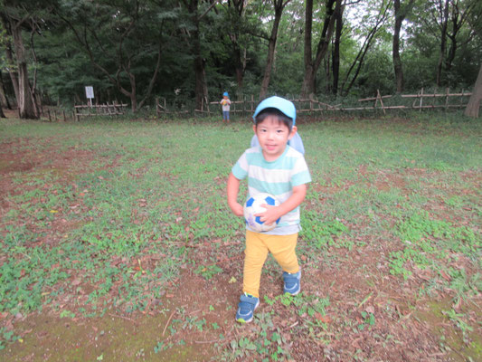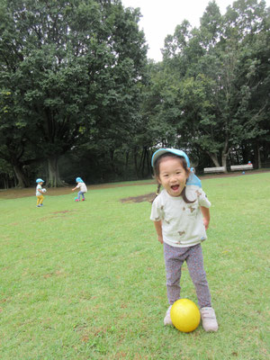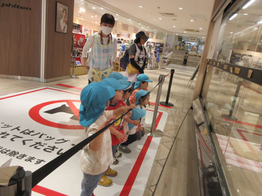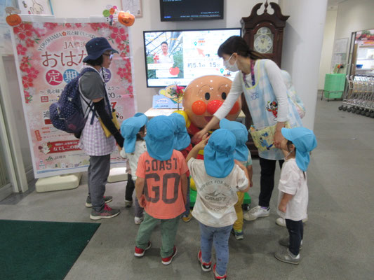 遺跡公園には、ボールを持って行き、上手に蹴ったり、保育者の足の間に転がして通して、自分もくぐってボールを取りに行ったり、ボールにボールをぶつけてみたりと楽しそうでした。帰りにノースポートに寄り、ペットショップの犬や猫を見てきました。「お店の中はアリさんの声だよ!」というお約束もしっかり守り、見ることが出来ました。最後にJAのアンパンマンにもごあいさつして帰ってきました。