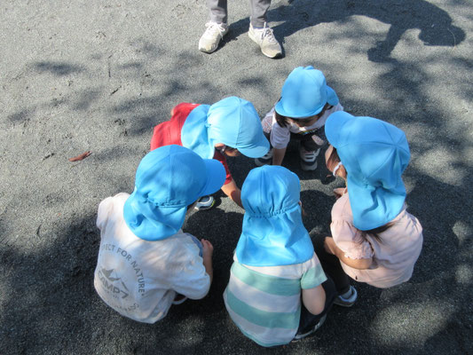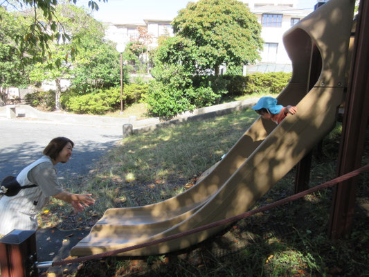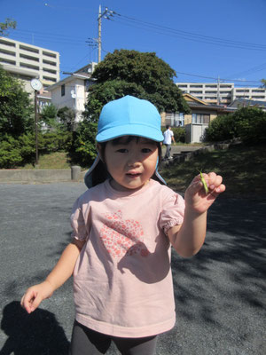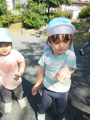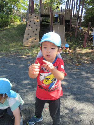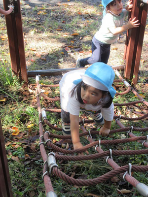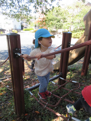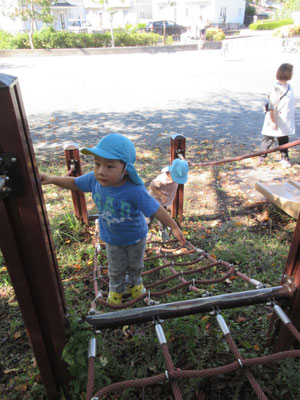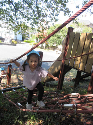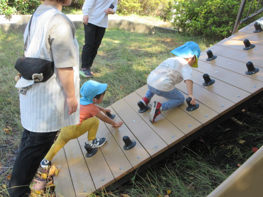 突起につかまって足をかけてのぼるボルダリングの様なところや、網になっている登り口をかわるがわるにみんな挑戦していました。揺れる橋もおそるおそる渡る子どもや足踏みして揺れを楽しんだりと思い思いに楽しんでいました。また、バッタを見つけ初めはおそるおそる触っていた子どもも他の子どもが掴んでいるのを見て挑戦し掴んで見せてくれました!