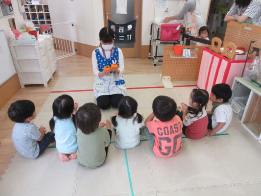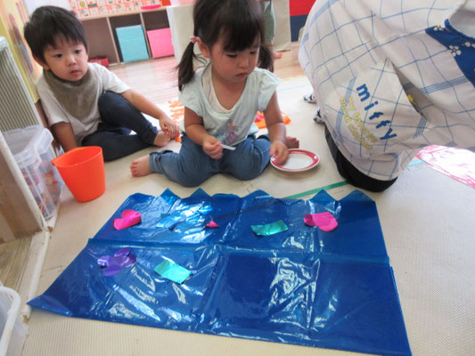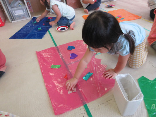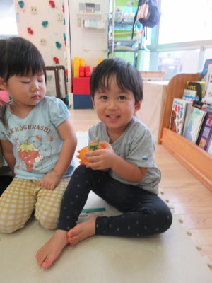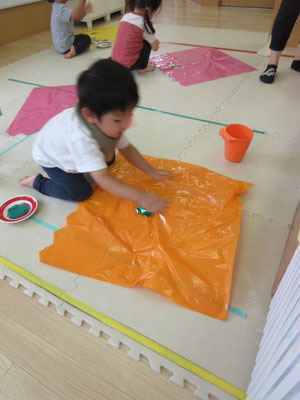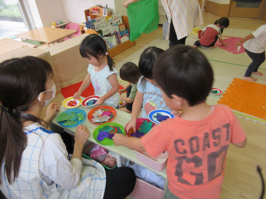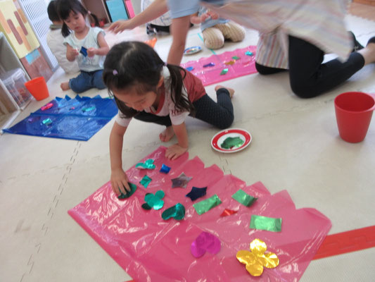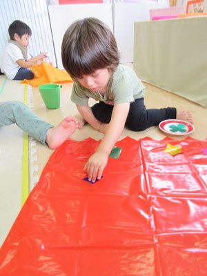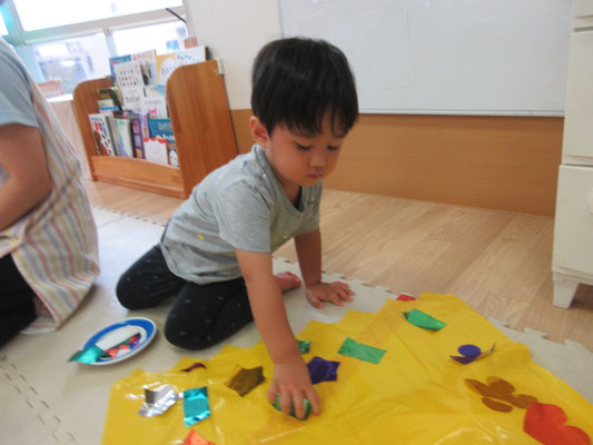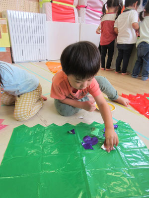 柿を見た後は、ハロウィンの制作をしました。自分で選んだ色のマントに、自分で選んだ色々な形のキラキラ折り紙を貼り付けました。並べて貼ったり、色を厳選して貼ったり、個性のある素敵なマントが出来ました。まだ完成ではありませんが、ハロウィン本番をお楽しみに!