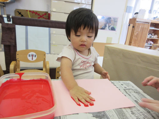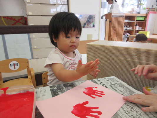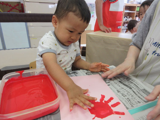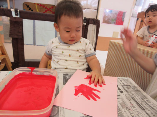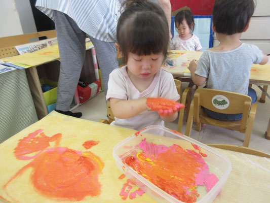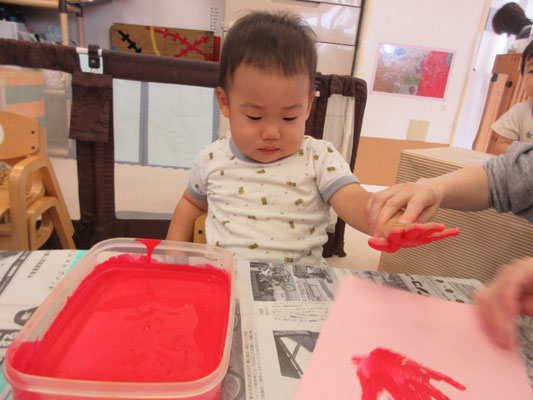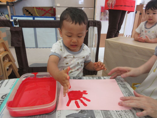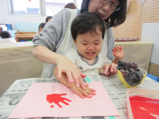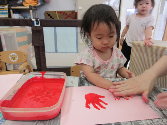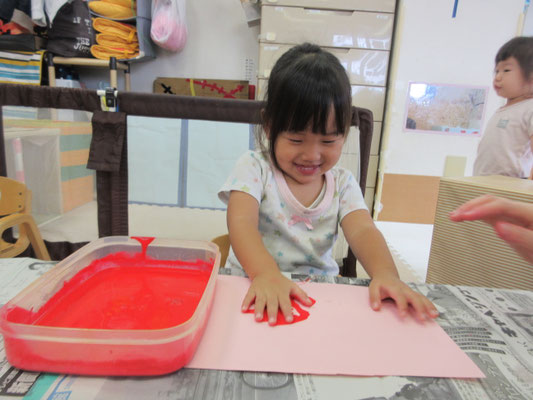 手形は、直接手に触れるので、絵の具が苦手な子にとってはハードルが高めでしたが、これまでにボディペインティングも何度か行ってきて、慣れつつあります。泣いてしまった子もいましたが、顔をしかめながらも自らスタンプする子もいました(笑)