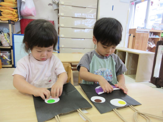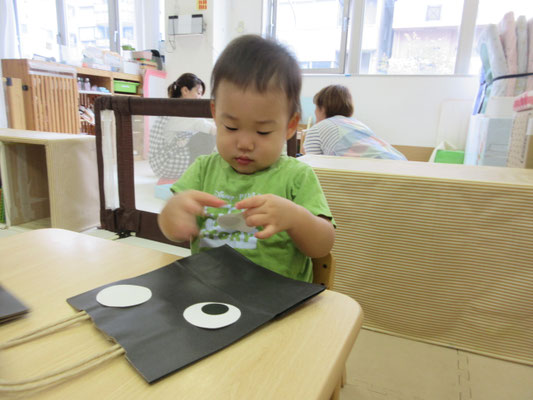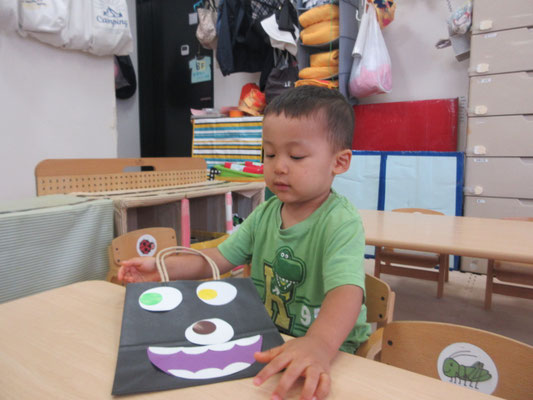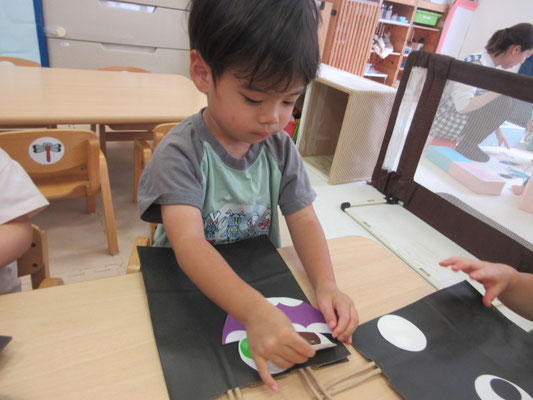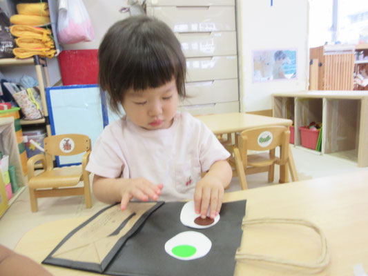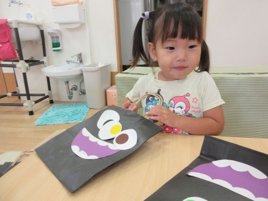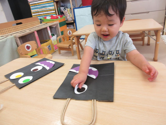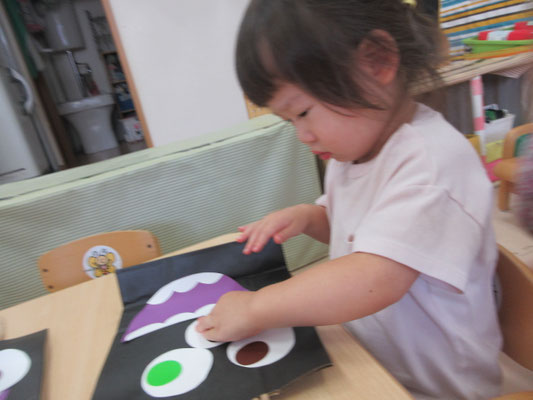 目と口を好きなところに貼ったり、中には貼りたい場所のイメージがついていて、貼りなおしている子もいました!おばけが嫌いな子もいて、「こわい…!」と言う子もいました。様子を見て無理なく進めていけたらなと思います。